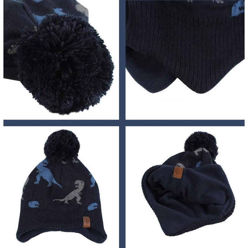 Malaxlx Kids Dinosaur Navy Blue Pom Pom Beanie Hat Winter Warm Child Knitted Earflap Hat Fleece Lined Ski Skull Cap for 4-8 Years Boys Girls