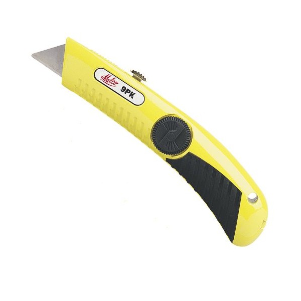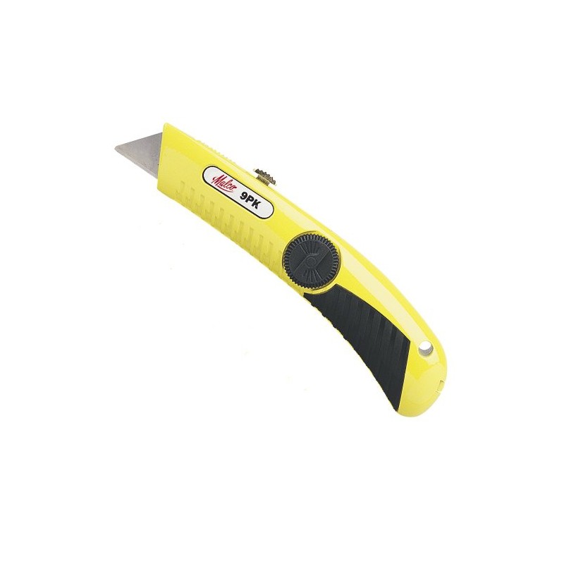 No tools blade change is fast and easy with just a turn of the knob. Extra blades store in handle. Retractable blade advances to 3 locked cutting positions with aid of thumb button. Heavy duty, die-cast knife halves feature integrated hinge to eliminate lost or dropped parts. Contoured knife shape features "ergonomic safety grip". One blade supplied in retracting mechanism.