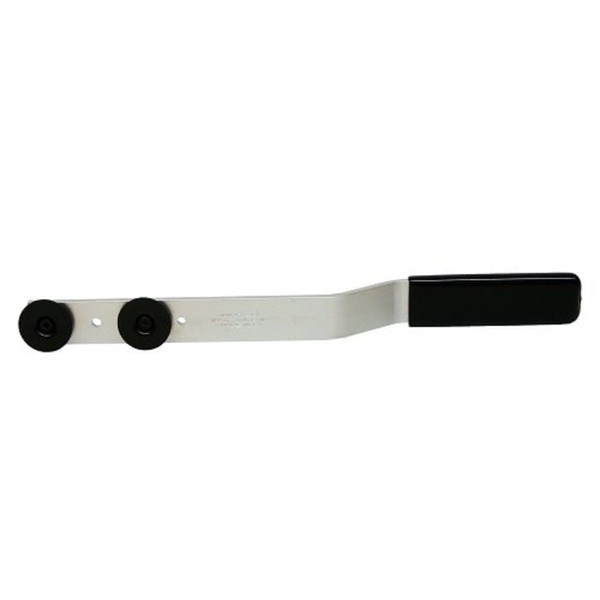 Duct stretcher, overall length 16 in. , handle design offset with Vinyl cushion grip, handle color Black, Material Aluminum handle, steel wheels, Features additional spacing holes allow wheels to be adjusted to span greater distances, hang hole in handle end'
