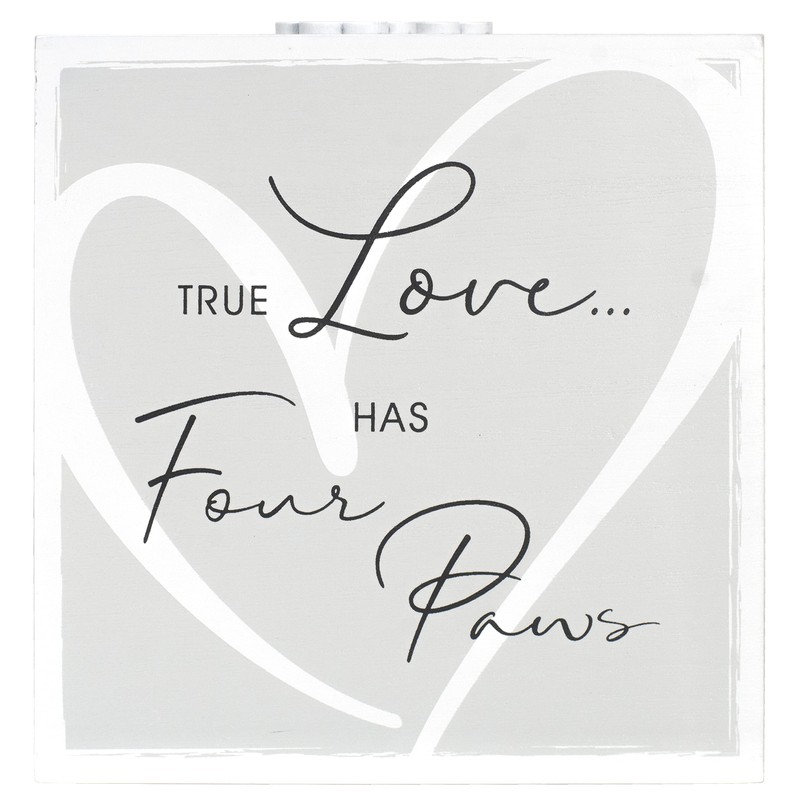 - CLASSIC STYLE: This decorative pet urn holds one 3.5” x 5” horizontal photo and features a wood paw print attachment. Touching front sentiment “No longer by our side... but Forever in our Hearts” and back sentiment “True Love... has Four Paws”. Product Dimensions: Approximately 6” (W) x 6.25” (H) x 3” (D)