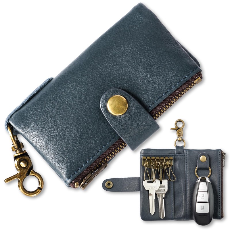 MALFY Men's Genuine Leather Key Case, Wallet Integrated Key Case, Made of Soft Luxury Top Grain Leather, Coin Purse, Card Case, Bill Holder, Smart Key, Wallet, Key Holder, Blue [Top Grain Leather]