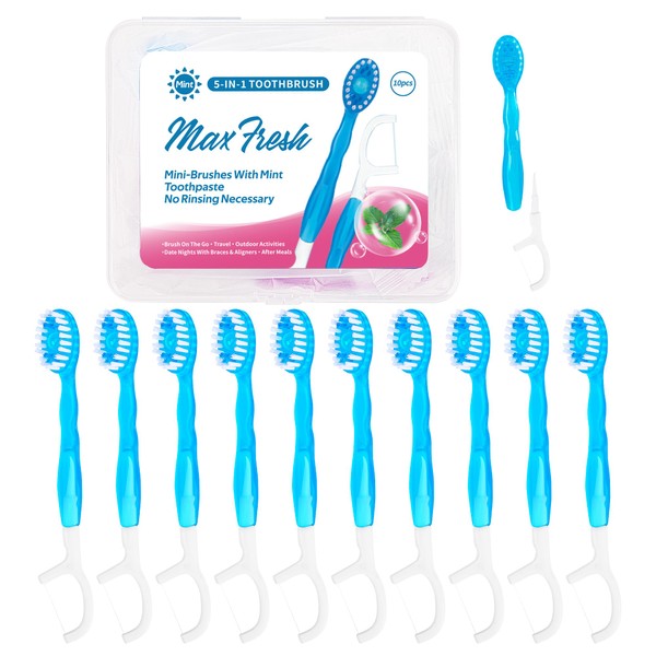 - 【5-in-1 Multi-Functional Toothbrush】10-count travel-size toothbrush with toothpaste, tongue scraper, foldable toothpick, and sturdy floss. Discover disposable toothbrushes tailored for convenient oral care anytime,anywhere. Ideal for travel, camping, after meals, dating, or guest bathrooms.