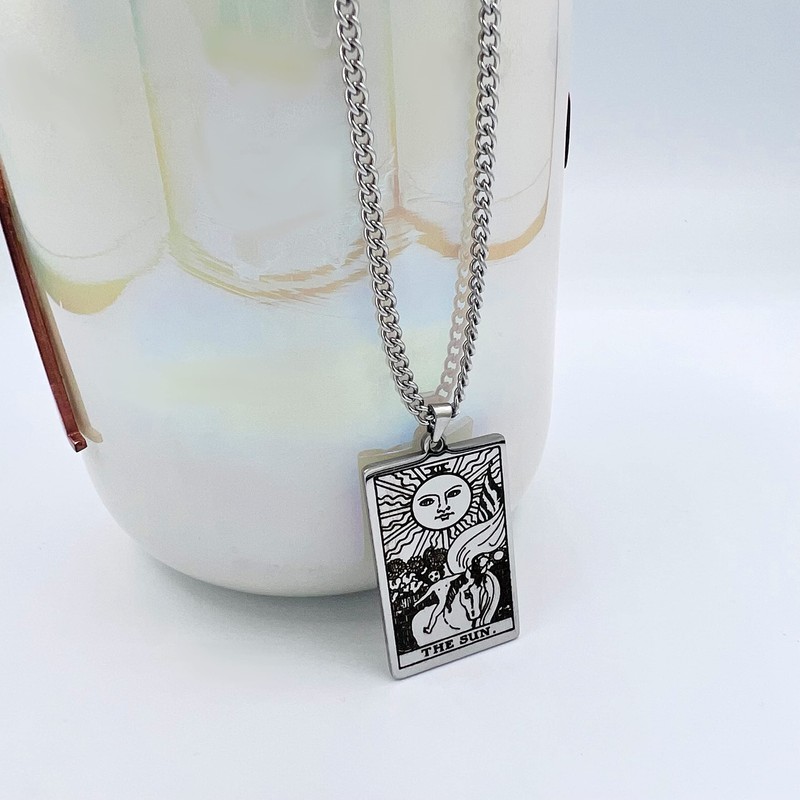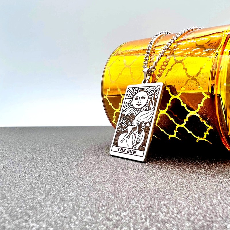 - 'The Sun' tarot necklace holds significance for anyone who practices and believes in tarot card readings. Gift the major arcana necklace set to yourself or to someone who believes in tarot. A prefect birthday gift, this 'sun' tarot necklace will swing in delight and swag in pride.