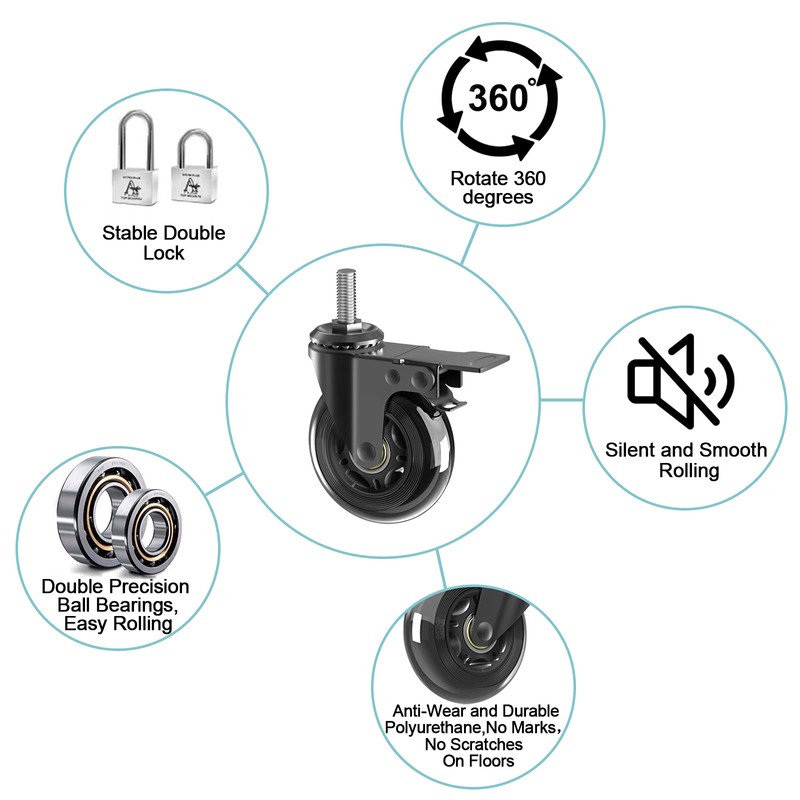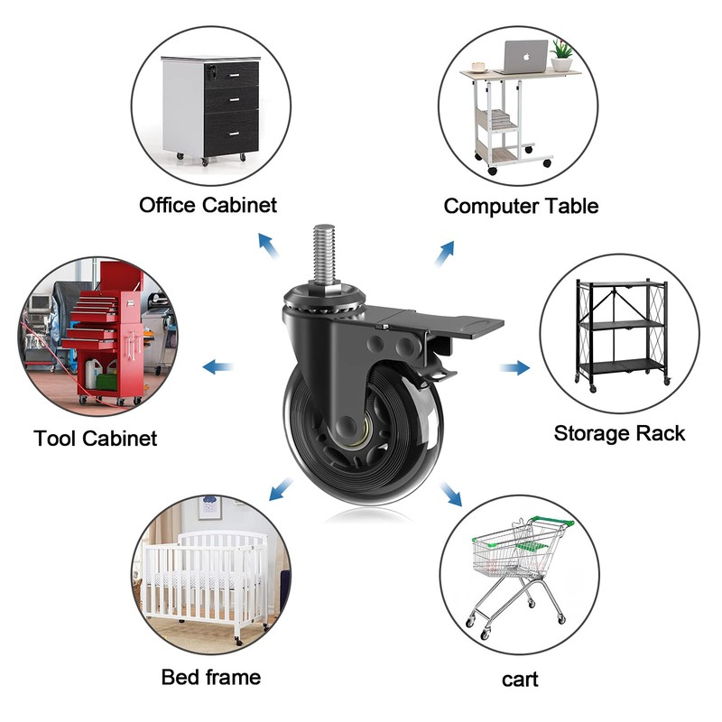 - PREMIUM MATERIAL & HEAVY DUTY SUPPORT LOAD:We all use top grade materials to ensure each caster has a long lasting performent.soft and polyurethane,2mm thick metal body bracket with anti-rust black electrocated paint,precision premium bearings,strong construction,heavy duty 3" casters can carry a total of 600lbs with a set of 4;