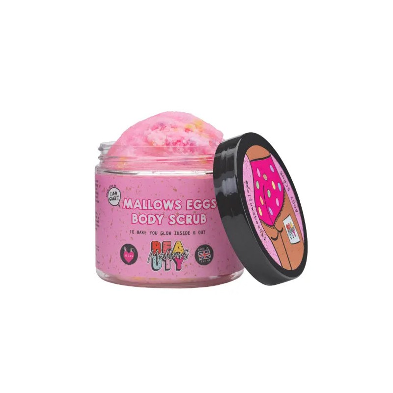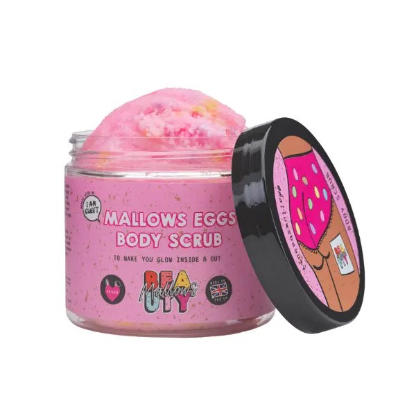 The Mallows Beauty Mallows Eggs Body Scrub is a grainy, sweet sugar scrub that magically makes your skin shine again. Do you suffer from dry, flaky skin or strawberry legs? Then this Body Scrub is what you need.