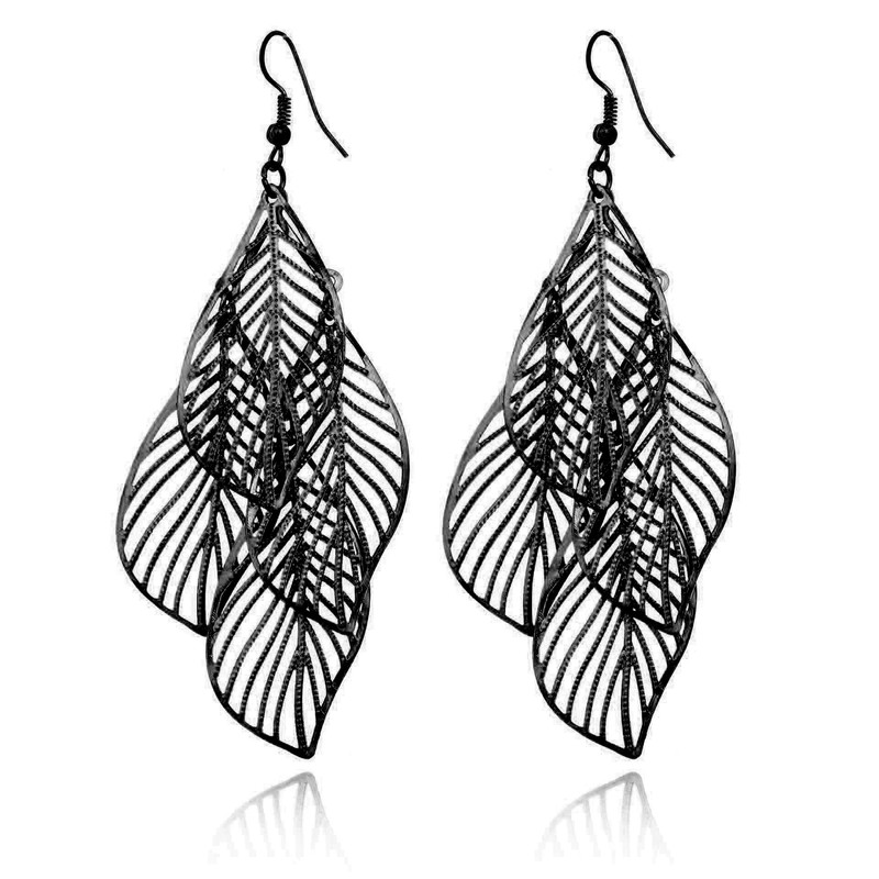 MALOYANVE Black Layered Leaf Earrings for Women Big Bohemian Lightweight Chandelier Hollowed Out Filigree Leaves Dangle Drop Earrings (Black)