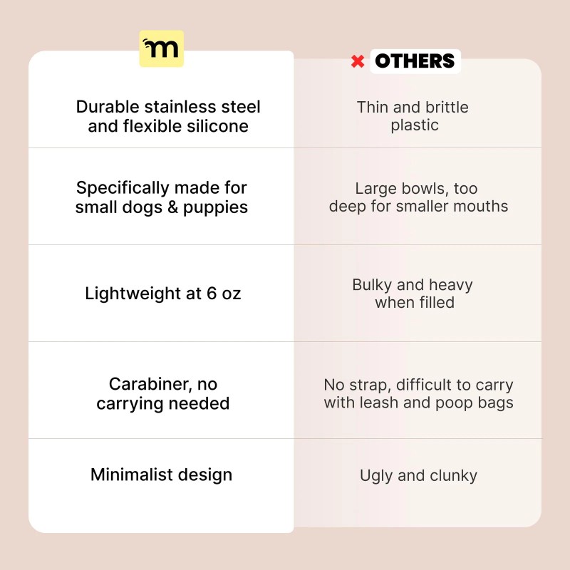 Lightweight & No Holding Needed: Compact design for compact dogs, our dog water bottles for walking weighs just 6 oz and holds up to 10 fl oz. Plus with it's carabiner, our bottle & travel water bowl for dogs attaches to your bag, belt or leash