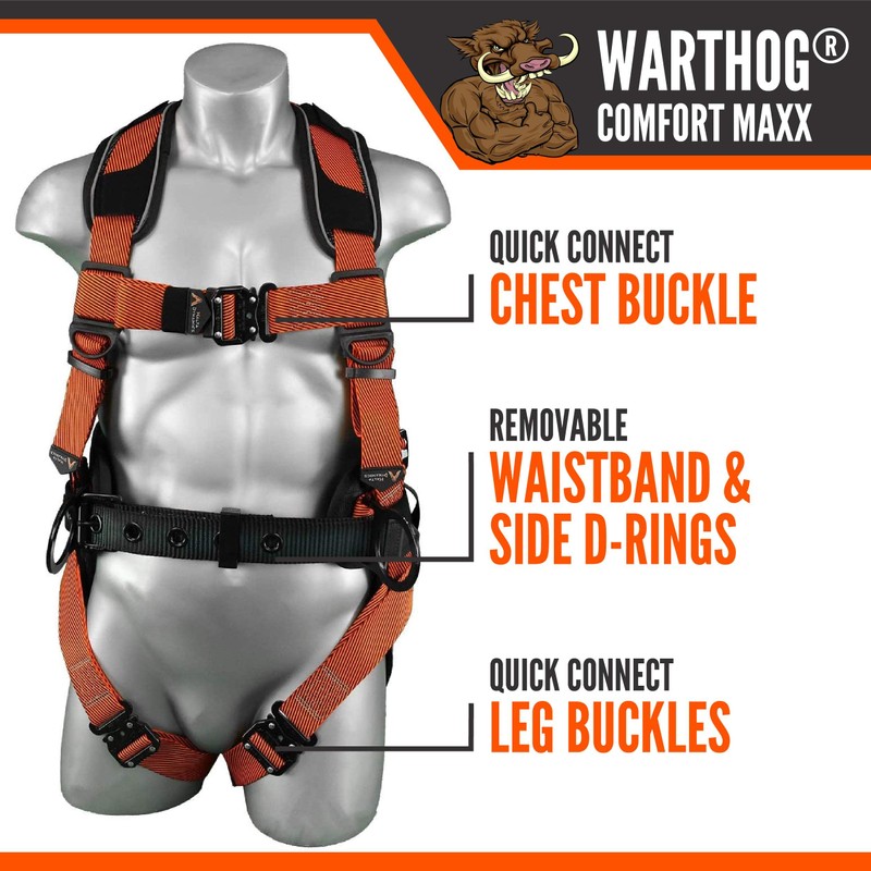 - Safety & Versatility: The Malta Dynamics Warthog Comfort MAXX Safety Harness Fall Protection provides maximum comfort and safety for workers with its full shoulder, back, waist, and leg comfort padding. The removable waist belt adds versatility to the harness