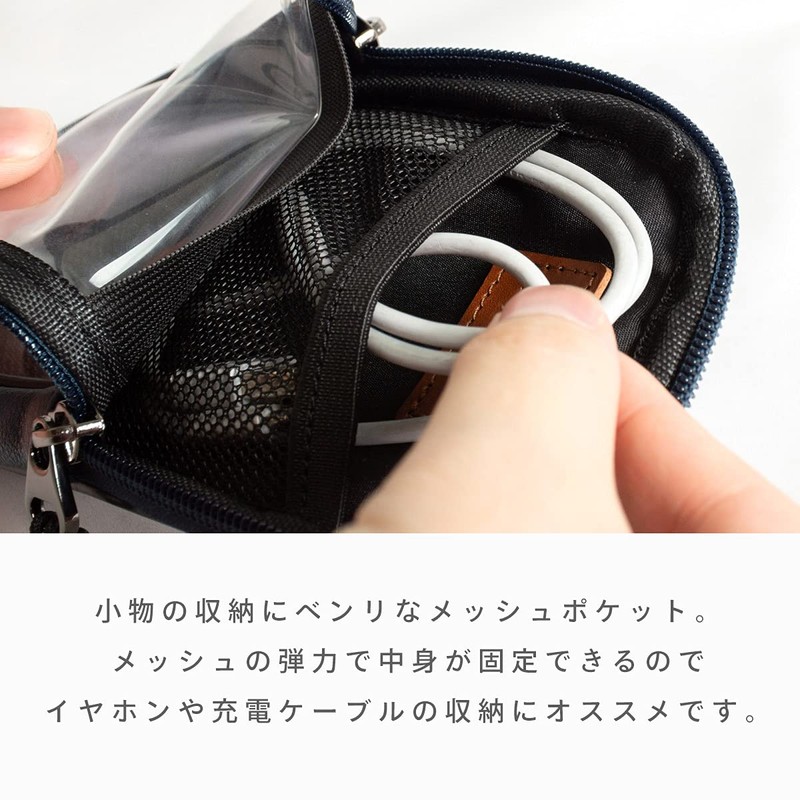 This pouch does not require any extra procedures, so you can check it on the spot and operate the screen right from the top of the case. When storing smartphones, the main unit can be secured with an elastic band. Easy touch operation with no gaps. It also has a handy mesh pocket for storing small items. The elastic mesh holds the contents in place, so it is recommended for storing earphones and charging cables