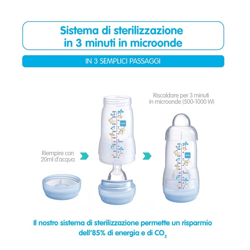- Self-sterilising: The Mam Anti-Colic bottle can be safely sterilised in the microwave with 3 simple steps, no need for a bottle steriliser.