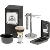 Materiales premium: Con una brocha fina, bowl/tazón para la espuma, rastrillo de calidad, estuche con espejo integrado y un soporte elegante para organizar tus accesorios.
