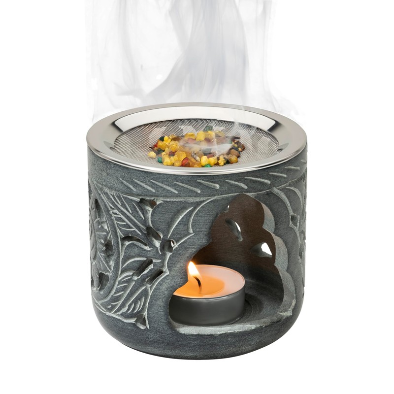 - Wonderful soapstone incense warmer, warmer for smoking made of soapstone. Ideal for smoking at home with a tea light. The heat of the tea light flame ensures a particularly gentle development of the fragrances and essential oil without burning the smoked food