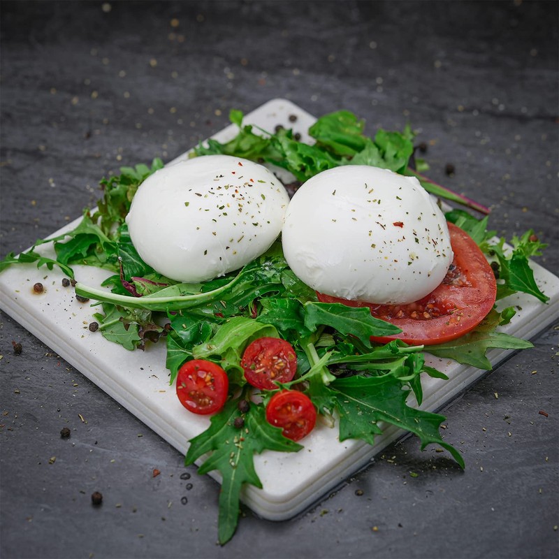 Our artisanal, fresh Italian Mozzarella Ovolini is made from cow's milk rather than buffalo milk. It is smaller than the standard Mozzarella and is “ovoline” or “egg shaped”. Mozzarella Ovolini has a high moisture content, with a texture that is firmer and flavor that is milder than buffalo mozzarella. It has a slightly off-white color. Nevertheless, it has a very creamy taste. Each pack comes with 2 balls of ovolini.