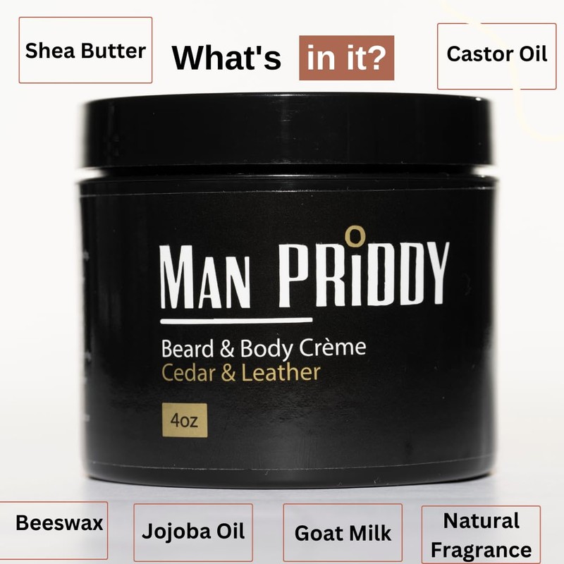 MAN PRIDDY 4 oz Cedar Leather Beard & Body Creme; 2-in-1 cream blend of all natural & organic ingredients designed to moisturize your body, beard and skin beneath while promoting beard growth.