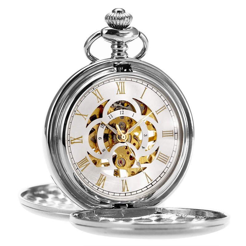 - SPECIAL DESIGN - FULL HUNTER & DOUBLE CASE series. Classic silver smooth case, Skeleton dial with roman numeral markers, shows Luxury, Vintage and fashionable!