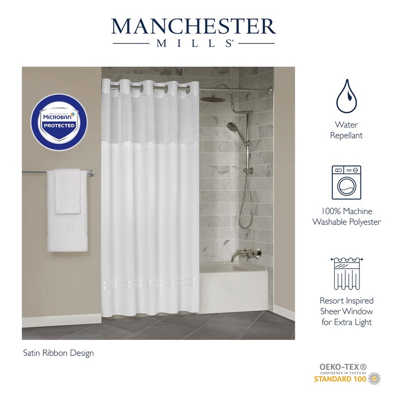 - BEYOND RESISTANT: Microban product protection properties help guard the shower curtain against unwanted odors, helping it to stay cleaner and fresher, longer. The Protect360° Satin White Ribbon Hook Free Shower Curtain is stylish, long-lasting, and hospitality grade quality