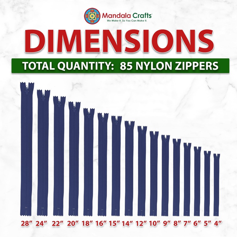 - Bulk Zippers in 17 Assorted Lengths: The 85 navy blue zippers have 5 nylon coil zippers in each size of 4, 5, 6, 7, 8, 9, 10, 12, 14, 15, 16, 18, 20, 22, 24, 28 & 32 inches.