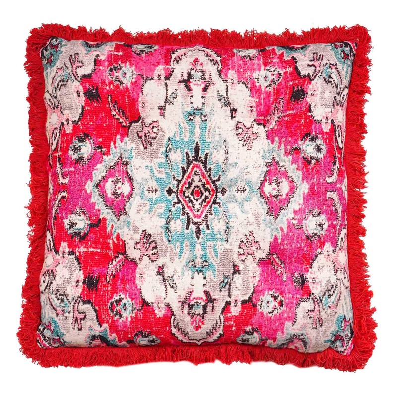 Mandala Life ART Square Vintage Cushion Cover with Fringes - 26 inches - Printed Pink Cotton Boho Chic Pillow Case