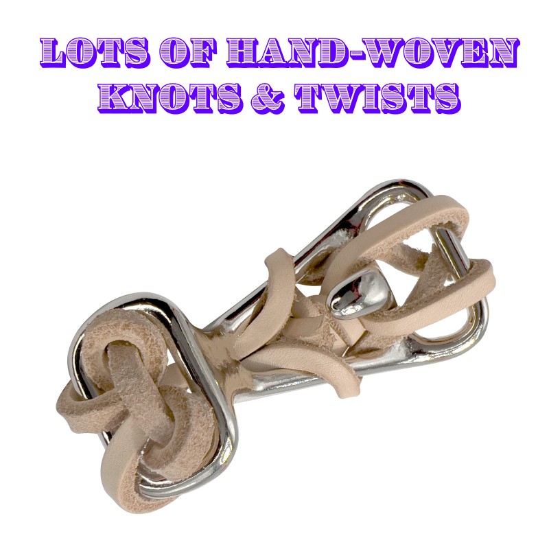 Each pack includes (1) Big Tooth Beak Weave ready to play with. This foot toy is a sturdy nickel plated steel frame that has a natural USA sourced vegetable tanned leather strip woven throughout. The leather strip makes lots of twists and turns and also has big chunky knots in different places. On the toy there are (3) openings and a large smooth protrusion on the front.