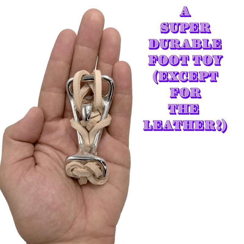 This toy gives tons of satisfaction for chewers. When larger beaks bite the toy they will cut through the leather and stop at the metal. This provides a stimulating destructive feeling that thrills birds natural instincts. Also birds can pull the leather strips up from the toy piece by piece. The frame is super durable and can have other materials added to it including more leather! The toy can also be hung up from the cage and from other larger toys. This is a long lasting, durable, versatile and flexible foot toy.
