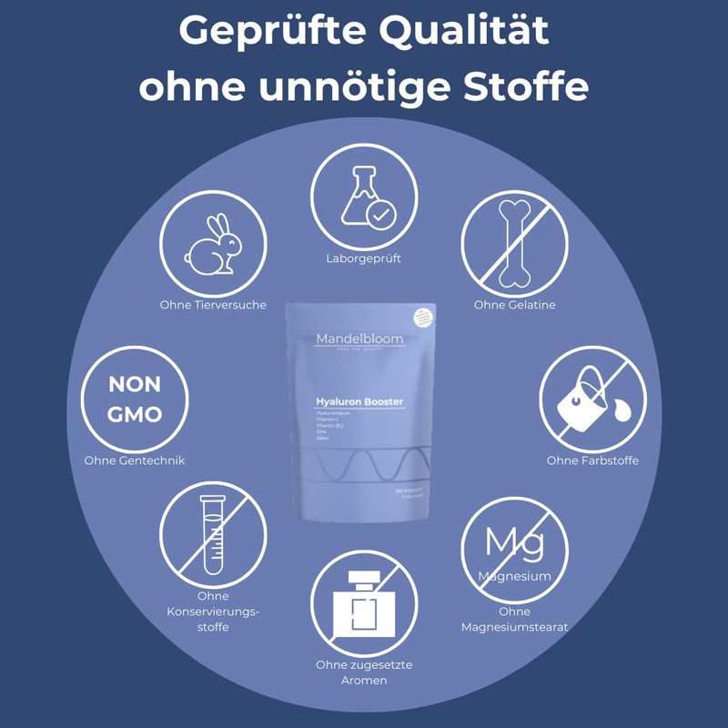 - SCH?NHEIT VON INNEN: Mit 500 mg reiner Hyalurons?ure pro Tagesdosis versorgt unser Mandelbloom Hyaluron-Booster deinen K?rper optimal. Zwei kleine Kapseln t?glich