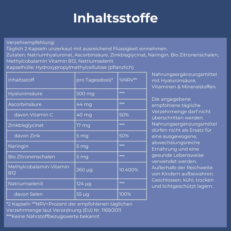 - GANZHEITLICHER EFFEKT: Hyalurons?ure ist ein natrlicher Feuchtigkeitsspender fr Haut und Gewebe. Unser Hyaluron-Booster enth?lt zus?tzlich Zink, das zur Erhaltung normaler Haut, Haare und N?gel beitr?gt C eine effektive Rundum-Pflege fr dich.