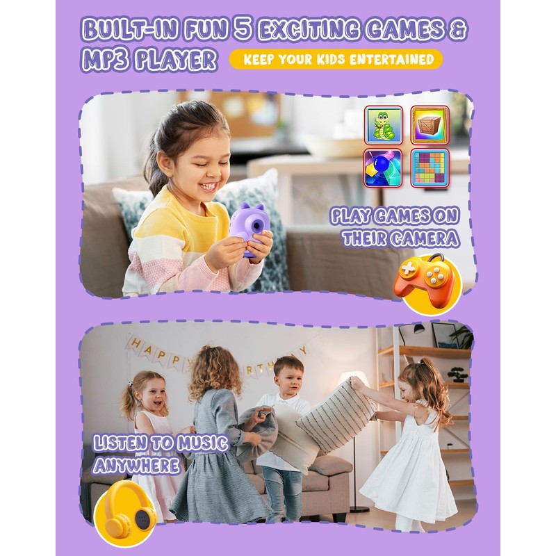 - Toddler Toys: Instant print camera for kids is an ideal choice for kids, equipped with a 2.4-inch screen,16x zoom & 1080P video. kids camera offers a range of features including time-lapse photography, continuous shooting, DIY photo frames, filters effects, mirror effects, 5 puzzle games & MP3 Player. whether it's recording memories, playing games or listen music can bring joy to children lives and be the perfect companion to accompany them in their happy growth