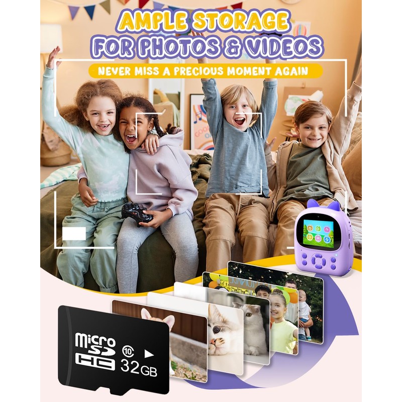 - Recording Childhood: Instant print camera for kids adopts Type-C charging technology, which charges faster and more efficiently. being fully charged, can take photos or play music continuously for 2-3 hours. This kids camera with instant print papaer 3 rolls, 1 Type-C cable, 1 lanyard & 32GB SD card. Capable of storing thousands of photos, preserving countless beautiful memories, and not missing any precious moments