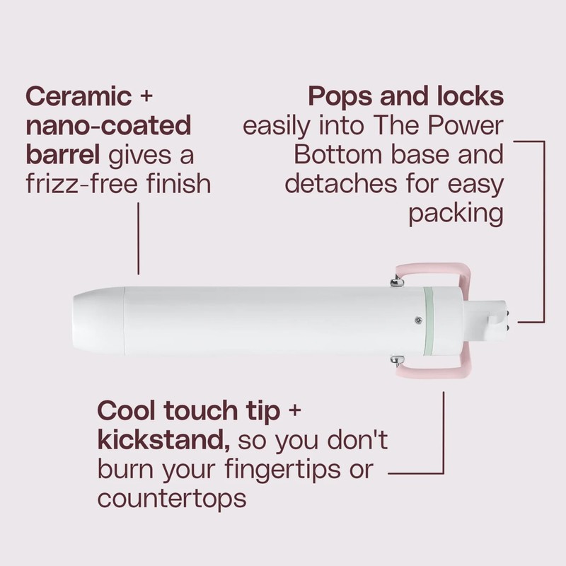- Key Benefits - The extra eight-inch barrel allows for styling wide sections, long hair, or hard-to-reach areas in one quick pass. The 1.25-inch barrel size easily creates undone waves and defined curls. Ceramic and nano-coated offer smooth styling without frizz. What Else You Need to Know: This 1.25-inch curling iron attachment is powered by the Power Bottom Base and has four precise temperature settings and auto-shutoff.