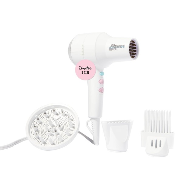 Mane Compact Ionic Hair Dryer With Diffuser, Wide Tooth Comb & Nozzle - 4-Piece Blow Dryer With Ionic Technology to Help Seal Cuticles, Reduce Frizz & Decrease Drying Time - Travel Size Hair Tools