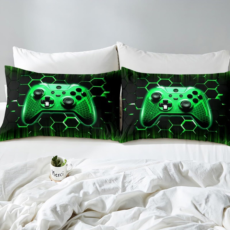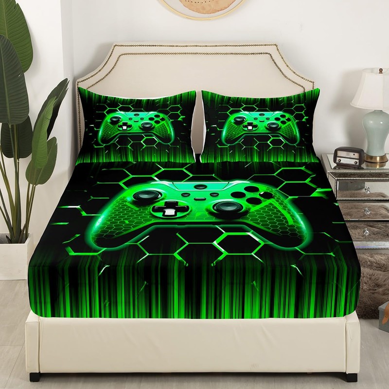 Manfei Modern Gamer Sheet Set Full Size, Green Honeycomb Gamepad Bed Sheet Set 4pcs with Deep Pocket Fitted Sheet + Flat Sheet + 2 Pillowcases, Vodeo Games Bedding Set for Kids Boys Girls Room Decor