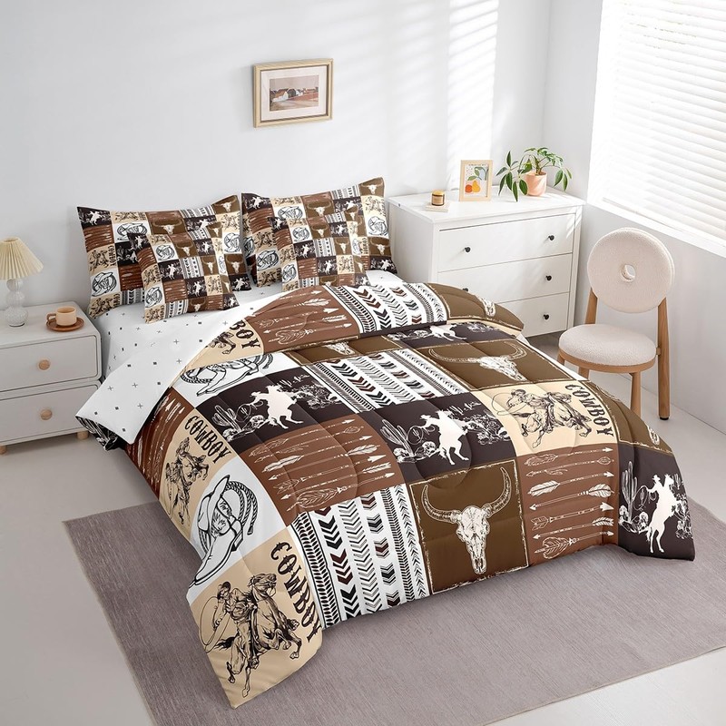 Manfei Western Cowboy Comforter Set 7pcs, Bull Skull Horse Arrow Print Bed Set, Brown Lattice Patchwork Bedding King with 1 Comforter,1 Fitted Sheet,1 Flat Sheet,2 Pillowcases,2 Throw Pillow Cover