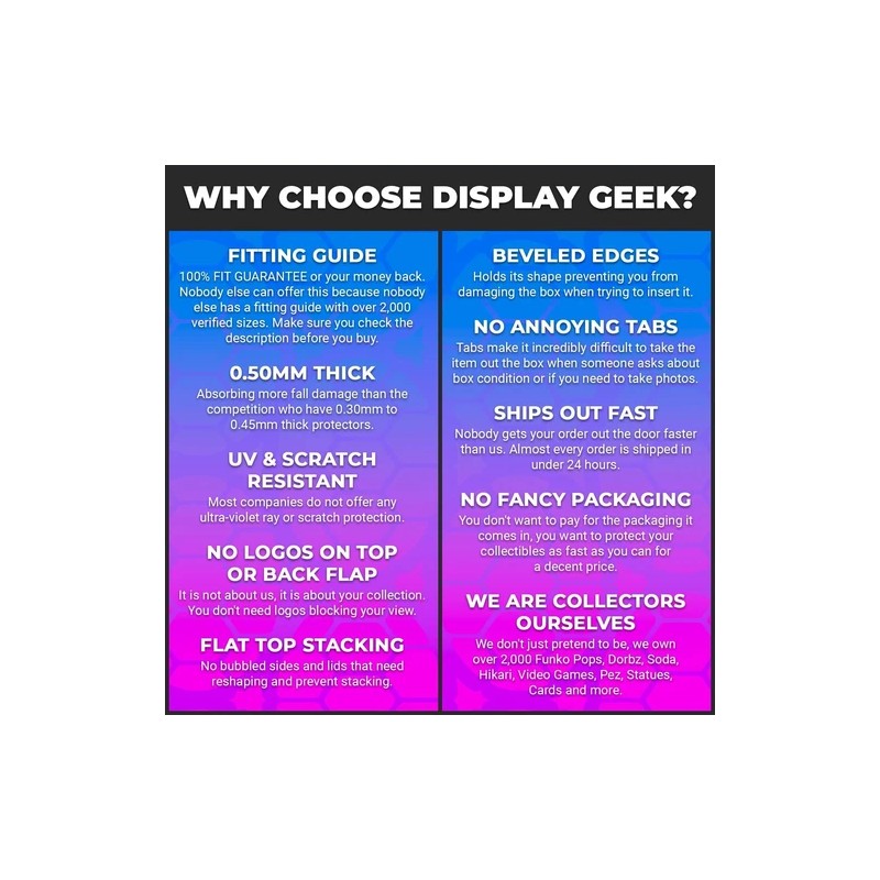 PLEASE READ: Please have a look at our other listings and read the fitting guide in the description before purchasing. If it is not listed in the description, do not purchase the item on a guess or assumption. Funko changes box sizes regularly. That is why we make sure to verify before we add them to the guide. Thank you.