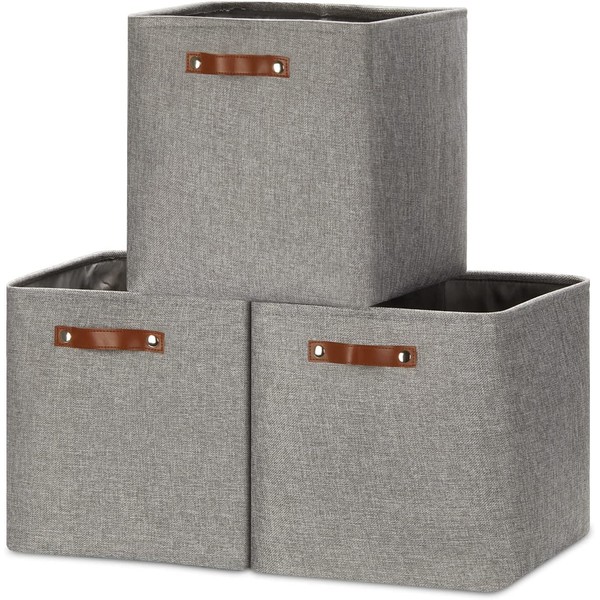 Mangata Collapsible Storage Cube Boxes, 28CM Cube Linen Woven Fabric Storage Baskets with Leather Handles 3PCS(Grey)