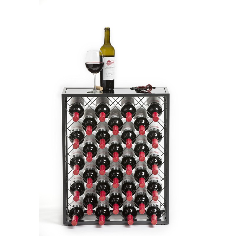 - ''' Holds 32 standard 750 ml size bottles.#||# Black tempered glass top adds extra functionality and style.#||# Steel construction with a durable powder coating.#||# No visible screws on exterior for a clean finish. Floor levelers for stability.#||# Dimensions: 26 3/4 H x 20 7/8 W x 9 D'''