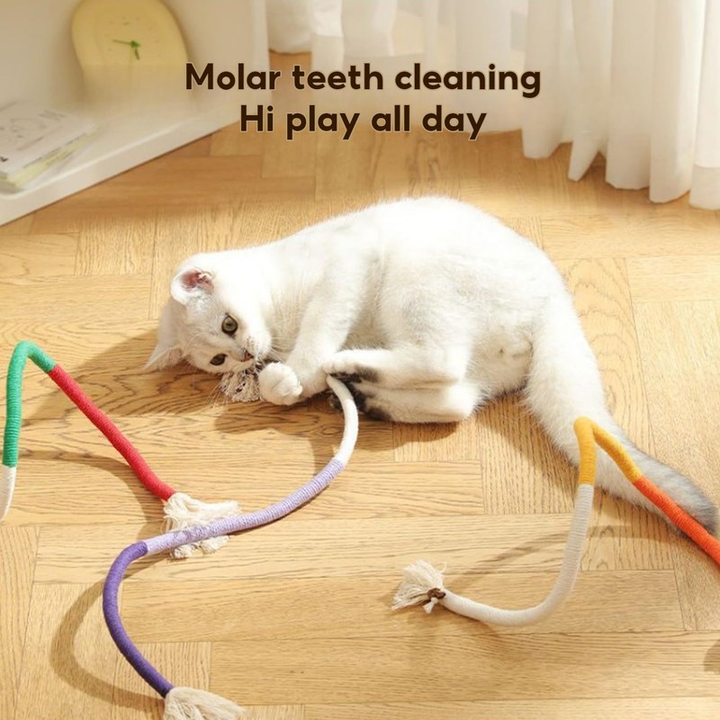• 【Suitable for all cats】Our cat teething chew toy is 27.56 inches long, providing plenty of space for cats of all ages to play, exercise and release energy, and it's made of soft and lightweight material, so cats can play quietly without disturbing your daily routine. Whether it's a daytime nap or a peaceful night's sleep, your cat is always ready to play and keep you company.