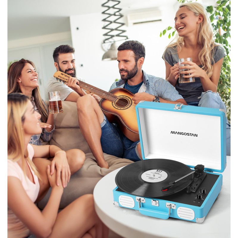 MANGOSTAN Record Player 3 Speed Bluetooth Portable Suitcase, Vinyl Phonograph with Built-in Bass & Speakers, Belt-Driven LP Player Support AUX-in RCA Line Out Headphone Jack, Blue