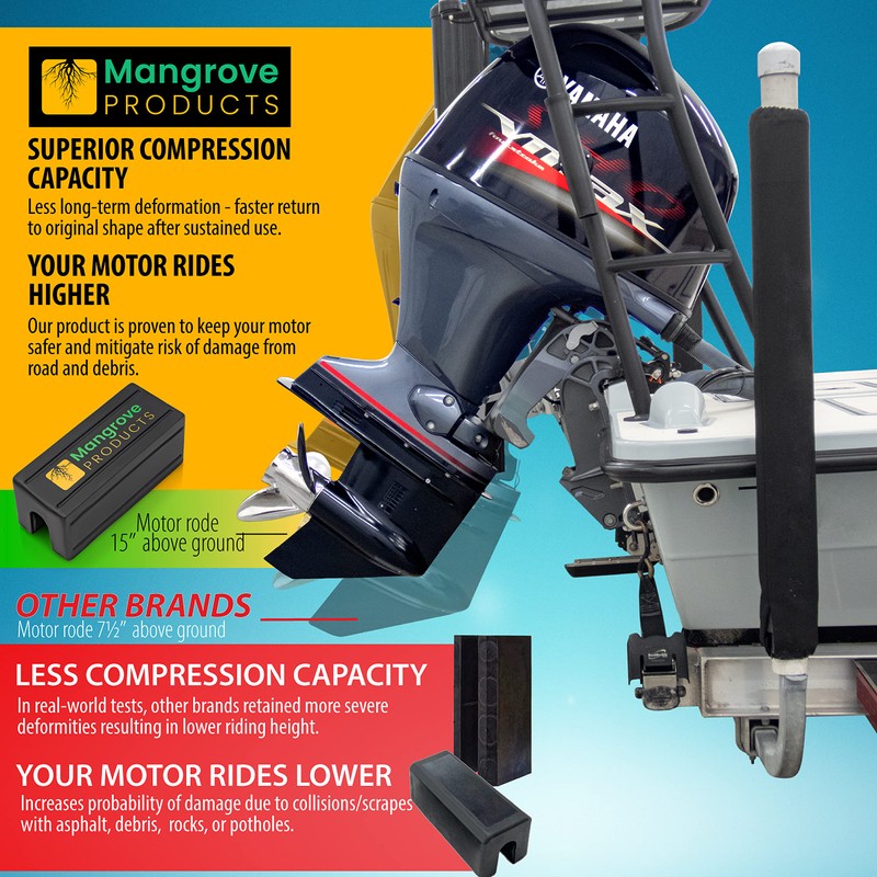 - ✅SIMPLIFY BOATING: Make your life easier and more enjoyable by eliminating the worry of potential damage to your outboard motor or transom when trailering your boat to your favorite fishing spot with the family, so you can focus on the fun. Wedge/Block can reduce strain to transom when hitting bumps on roadway. NOTE: Compression will flex the rubber wedge which is a normal process. The high pressure EPDM wedge creates a barrier of support to prevent damage to transom and tilt/trim unit.