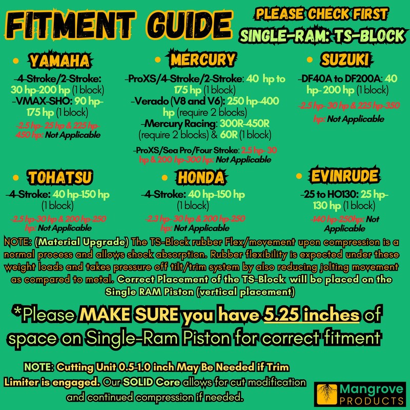 - ✅FITMENT GUIDE: (Update) Yamaha 4-Stroke/2-Stroke: 30hp-200hp, VMAX-SHO 90hp-175hp (1 block) Mercury (ProXS, 4-Stroke, 2-Stroke) 40hp-175hp, Verado (V8+V6) 250hp-400hp (2 blocks), Mercury Racing 300R-450R (2 blocks) + 60R, Suzuki 40hp-200hp (1 block), Tohatsu 40hp-150hp (1 block), Honda 40hp-150hp (1 block), Evinrude E-Tech (H.O.+ Inline) 25hp-130hp (1 block). Make sure to attach to Single Ram Piston. A premium product for your premium engine. A boat accessory that will last.