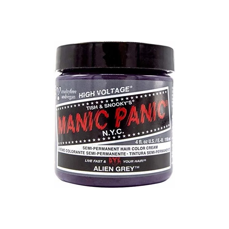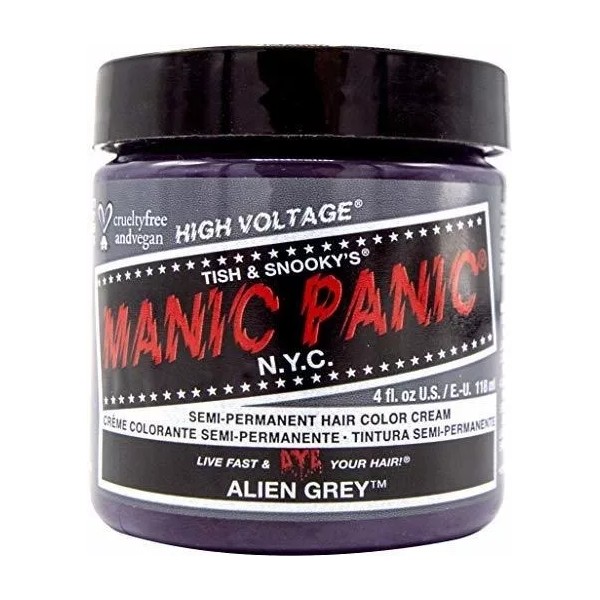 MANIC PANIC ALIEN GRIS TINTE COLOR: Un fresco, tinte gris pizarra medio .; SEMI PERMANENTE TINTE: Este semi fórmula tinte para el cabello permanente se desvanece gradualmente en 4-6 semanas, ya que no penetran en la corteza del cabello, sino que simplemente descansa en la parte superior del eje del pelo .; COLORES mezclables y Tonos: Personalizar oscura, cabello claro, largo o corto con esta lista para su uso, sin mezclar el tinte de pelo Manic Panic. Crear un color pastel suave de la persiana elegido mediante la adición de Manic Panic pastel-izante .; Libre de crueldad, FORMULA VEGANO - Este colorante crema para el cabello de color cuenta con ingredientes veganos probados en las celebridades, no animales. Hecho en los EE.UU., el color del pelo es PPD y sin amoniaco, sin parabenos, sin gluten-resorcinol libre, libre de ftalatos y PETA acreditado .; Para mejores resultados: resultados de color vibrantes se logran mejor mediante la aplicación al cabello que ha sido pre-iluminada con Manic Panic Relámpago Bleach Kit al nivel más ligero 10 rubia antes de su uso. Todos nuestros productos estan en inglés SKU 5022013074