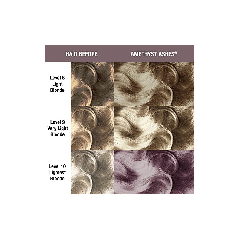 - Amethyst Ash Hair Dye Color; A Smokey Grey Hair Dye With Cool Purple Tones; For The Best Results We Recommend Lightening Hair To The Lightest Level Ten Blonde Before Use