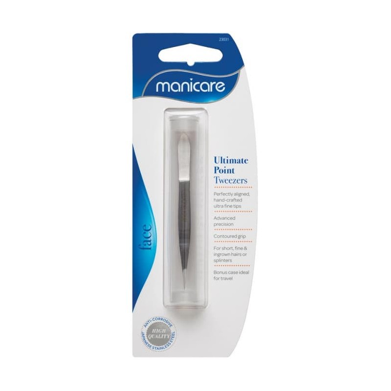 Manicare's Ultimate Point Tweezer is made with perfectly aligned, hand crafted ultra fine tips for ultimate precision. Using high quality, Japanese stainless steel with a contoured grip for control. Ideal for easy removal of short, fine or ingrown hairs & splinters. Includes a storage case.