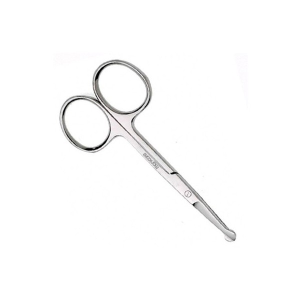 Stainless steel scissors with rounded tips and grounded blades designed to cut nasal and ear hair with safety and ease.