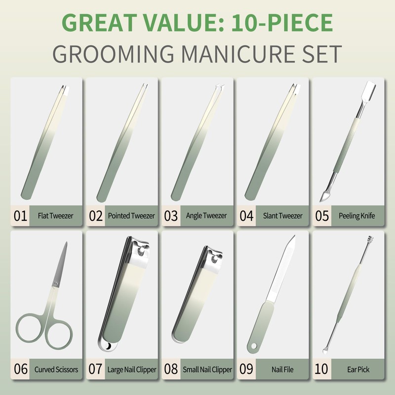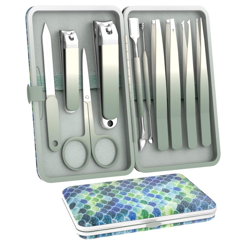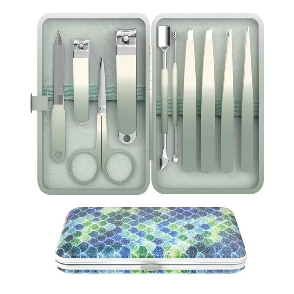 Manicure Set 10 in 1 Stainless Steel Nail Clippers Scissors Tweezers Grooming Kit with Travel Case(Green)