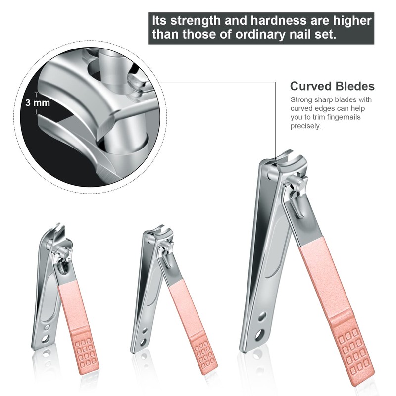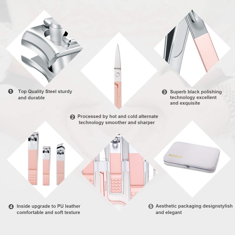 - UNIQUE DESIGN Our nail clippers set, whose highlight are rose gold tools with a white high quality PU leather case, feels comfortable, fashionable and practical. This is the first time to show on the market. You will love it. Not only with comfortable, but also easy to trim. It is an excellent quality gift for Christmas, birthday, anniversary and marriage.