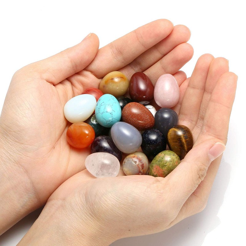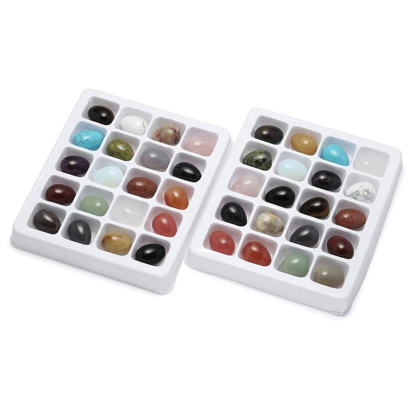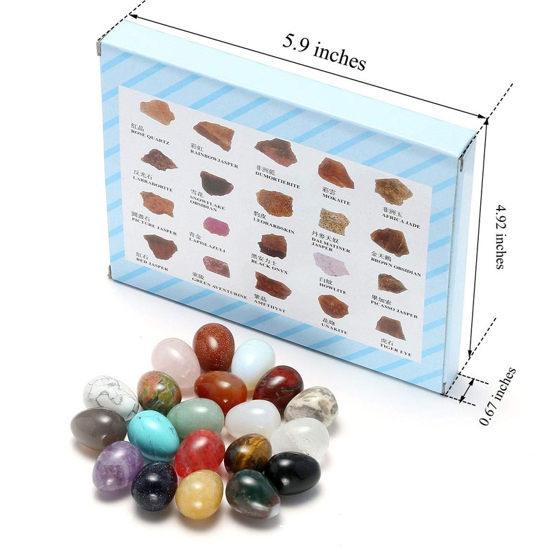 Mineral Variety Egg Shape Tumbled Stone 20pcs Healing Crystal Mini Energy Meteorite Polish Gemstone Collection with BoxDescription:Material:Crystal Gemstone (Please note that 20pcs crystal stone are packaged in random from the following material:moonstone, leopardskin jasper, hematite, Amethyst, Lapis Lazuli, Amazonite, picture Jasper, rose quartz, lemon jade, turquoise, moss agate, tiger eye, blue lace agate, Red Agate, rock crystal, white howlite, Obsidian, strawberry quartz, Chicken Blood Stone, serpentine and so on.)Beautiful and high quality hand carve polish mini egg shape mineral gemstones. Perfect for gemstones collector.Each of them comes with collecting box, easy to store and ready for giving.Please Note:If you have any problem about the product, please contact us through buyer seller message. We promise we will solve it with you, buy absolutely no risk.