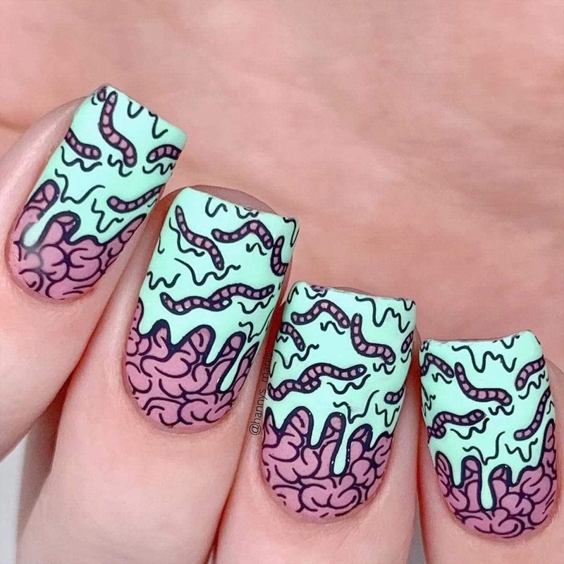 - Bad to the Bone (M158) is almost too cute to spook. Dig deep with a variety of layered Halloween nail art designs. Go under wraps with mummies, carve into glowing jack-o-lanterns, or create jaw-dropping skeletal manicures! Whatever you do this Halloween, this plate will help you creep it real.