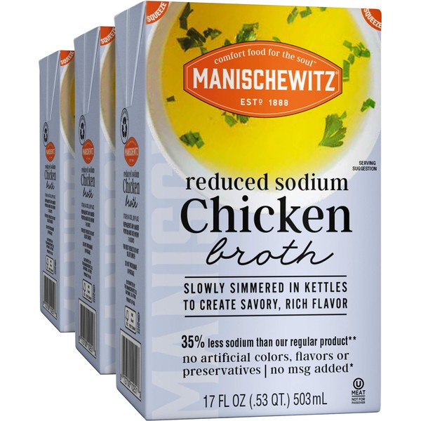 Manischewitz Reduced Sodium Chicken Broth 17oz (3 Pack), Flavorful, Kettle Cooked, Slowly Simmered