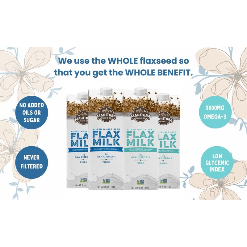Manitoba Milling Company Vanilla Flax Milk| Unsweetened | 3000mg ALA OMEGA-3 | 2 Tbsp Flaxseed per Serving | 4g Protein & 3g Fiber | Non-GMO, Plant-Based, Non-Dairy| Shelf-Stable, 32 oz (Pack of 6)