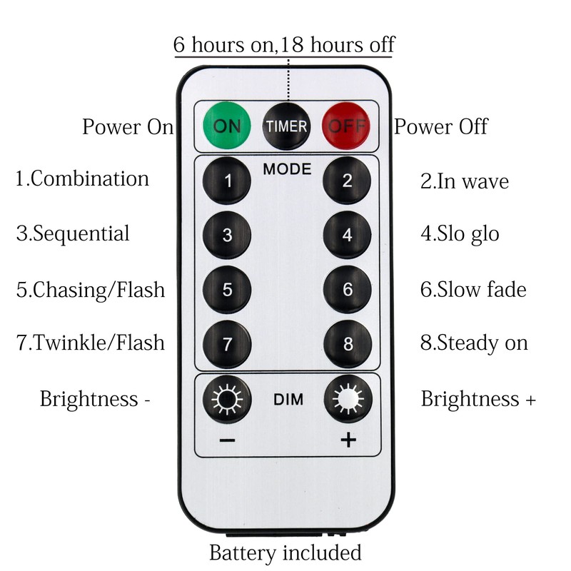- 8 modos de luz y brillo regulable: pulsa DIM- o pulsa DIM+ del control remoto para ajustar el brillo de las luces, 8 modos de iluminación para hacer tu vida colorida.